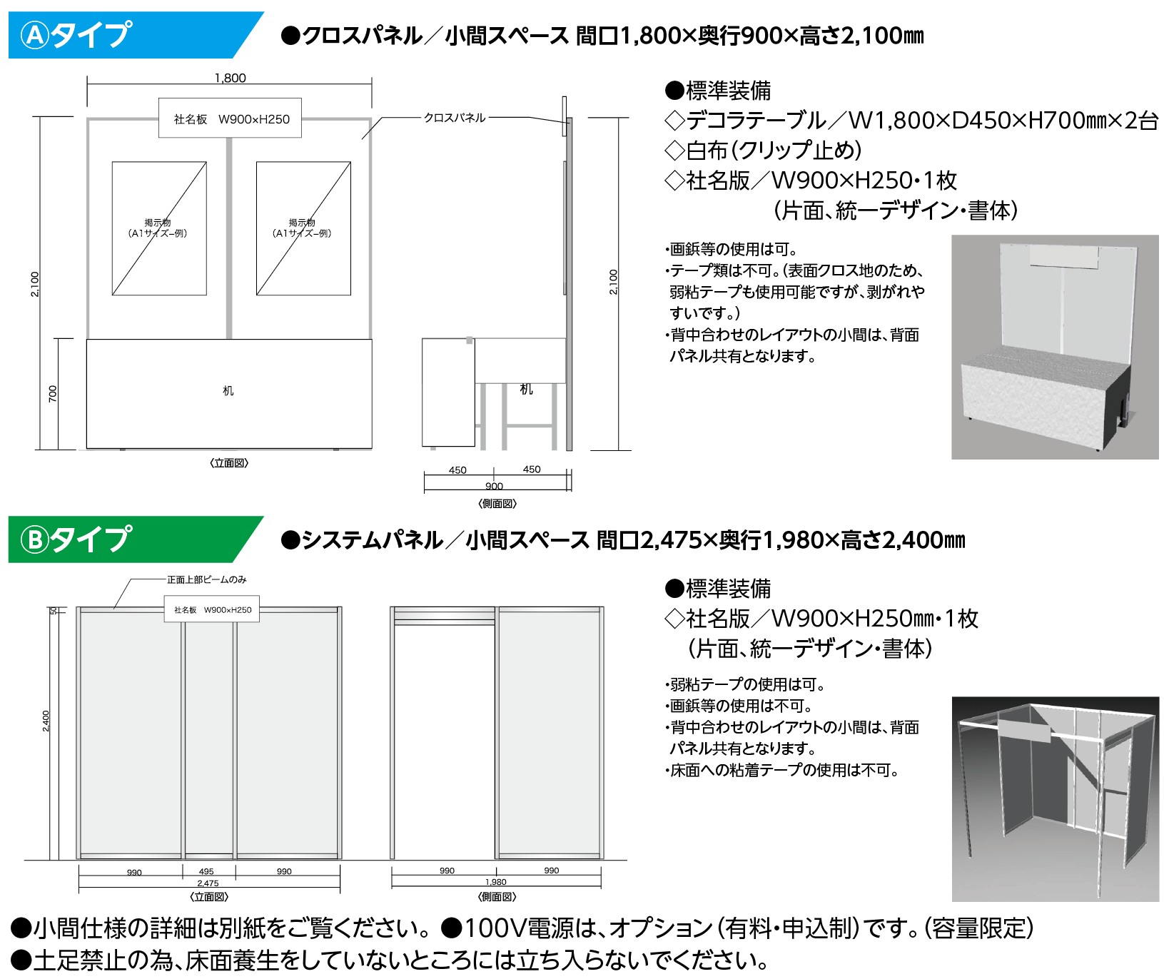 - 小間仕様については、別紙をご覧ください。 ●100V電源は、オプション(有料・申込制)です。(容量限定)